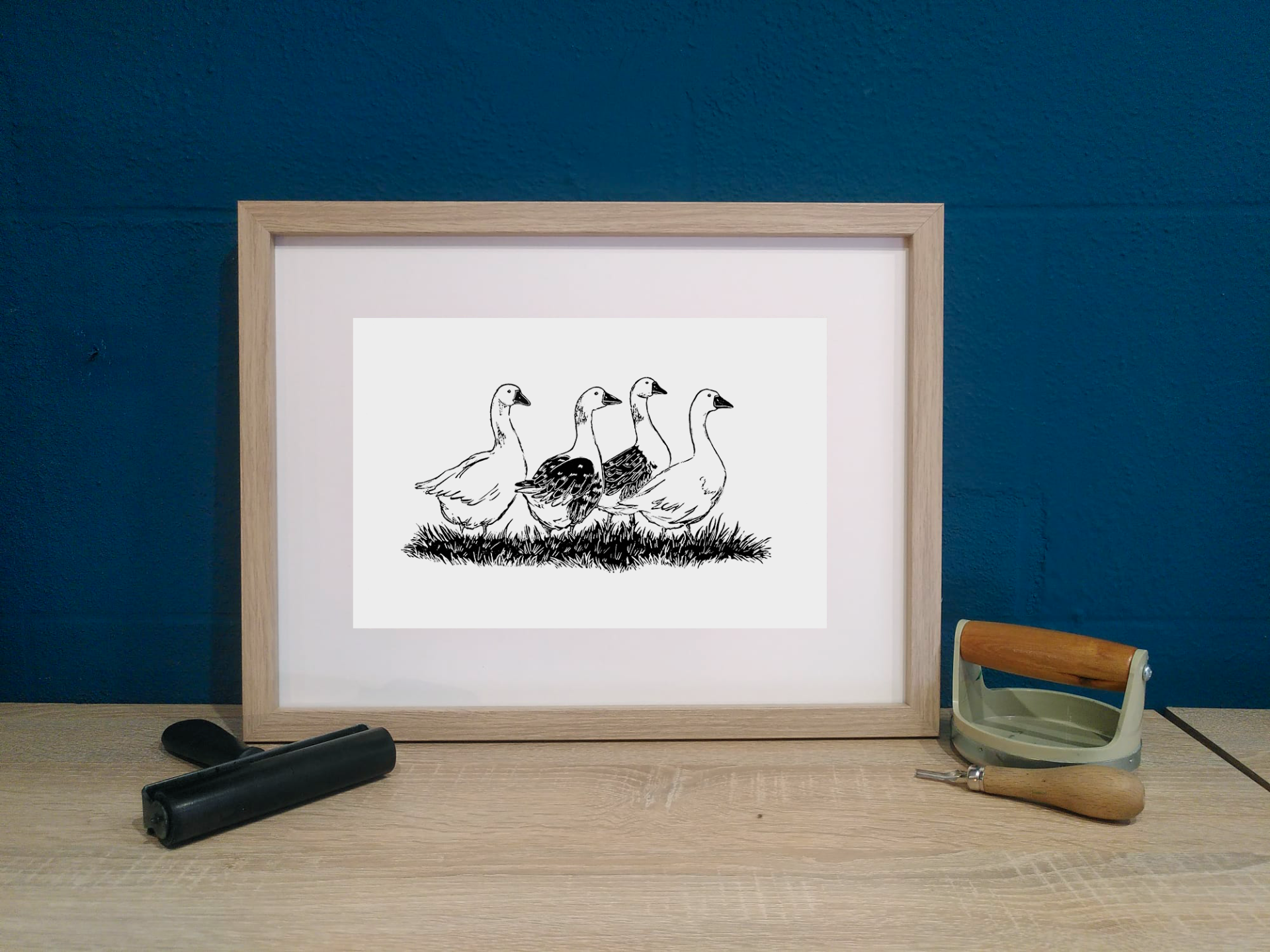 Linogravure originale signée par Alicia Cuerva représentant un petit groupe d’oies. L’œuvre fait partie d’une série sur les animaux rescapés réalisée pour l’agenda 2026
